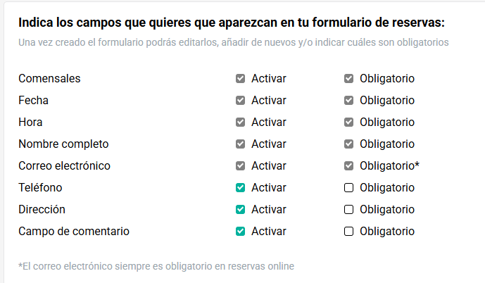 - Activa todos los campos que desees incluir en el formulario para que tus clientes puedan completar su información.