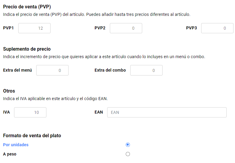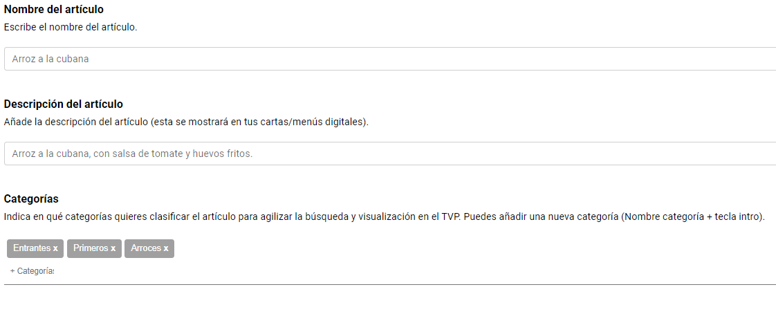 *Recomendamos indicar una o más categorías al artículo para localizarlo más rápidamente en nuestro listado de artículos o en nuestro TPV/comandero.