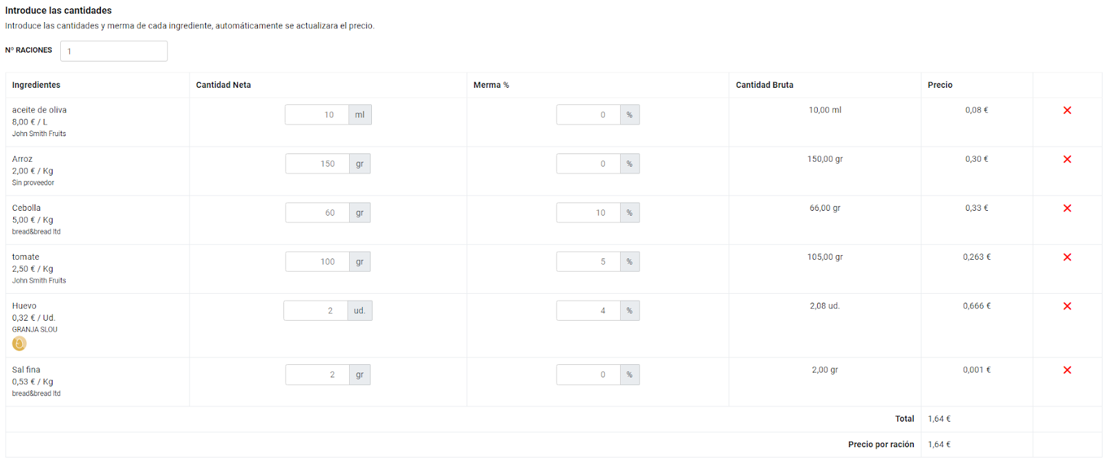 9. A continuación, especifica las cantidades y la merma de cada ingrediente necesarias para preparar el plato.