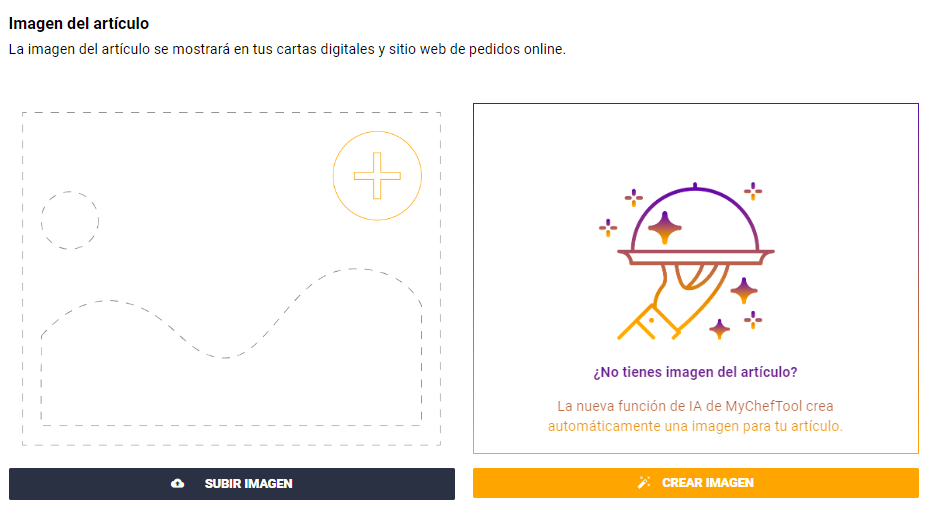 5. Agrega una imagen del artículo. Puedes subir tu propia imagen del plato o usar la función de IA de MyChefTool para generar automáticamente una imagen para el artículo.