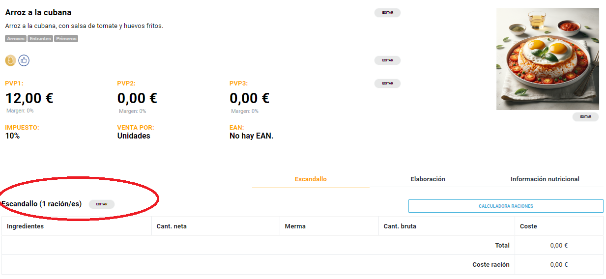 Aquí tienes una guía paso a paso para crear tu primer artículo con escandallo. Vamos a usar como ejemplo un plato conocido, el “Arroz a la Cubana con salsa de tomate y dos huevos fritos”.