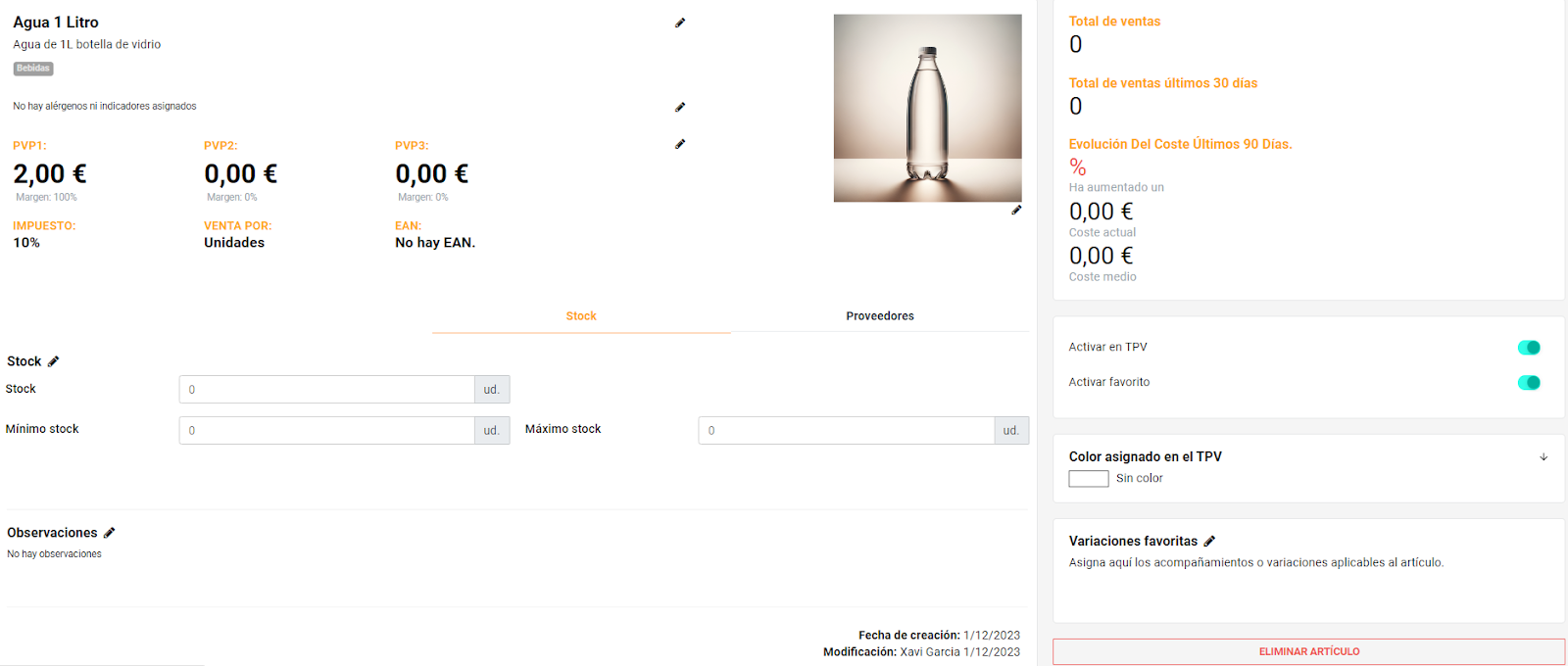 *Si vas a trabajar con el TPV MyChefTool no olvides verificar y completar la parte derecha de la ficha del artículo. Activarlo en el TPV (activación automática predeterminada), marcarlo como favorito o asignarle un color para su fácil localización en el TPV.