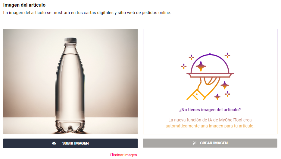 *Puedes subir tu propia imagen o usar la función de IA de MyChefTool para generar automáticamente una imagen para el artículo.