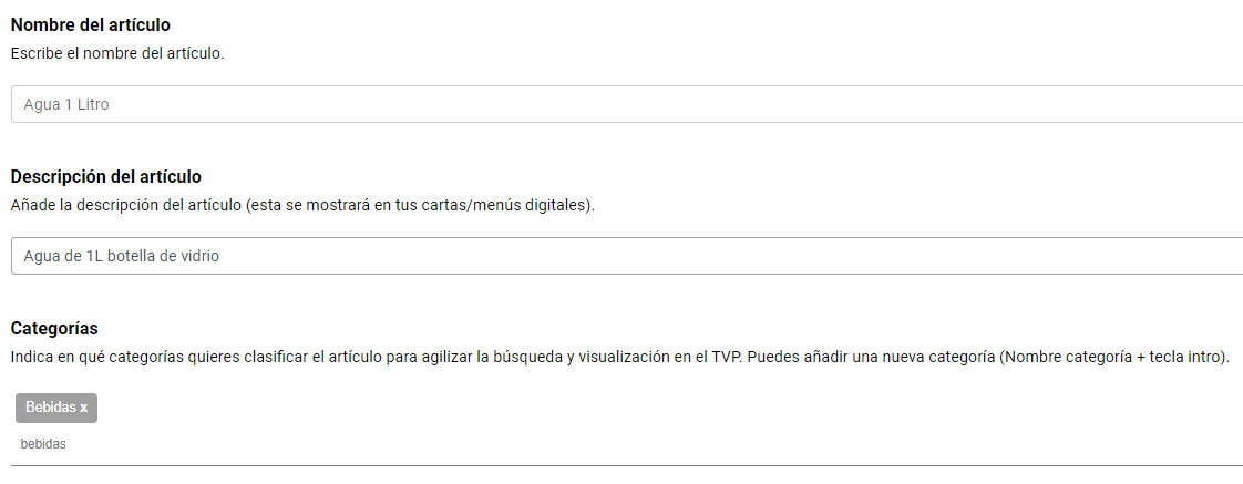 *Recomendamos indicar una o más categorías al artículo para localizarlo más rápidamente en nuestro listado de artículos o en nuestro TPV/comandero.