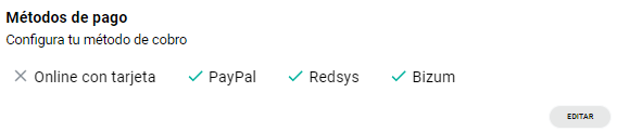Selecciona la opción “MÉTODOS DE PAGO” y pulsa en editar en alguna de las opciones de pago que te ofrece nuestro sistema.