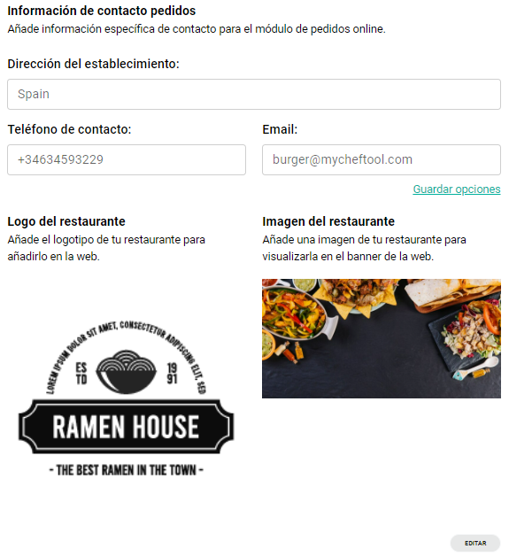 Además, en esta misma sección, también podrás editar el logo y la imagen de tu restaurante. Se recomienda utilizar un logotipo en blanco y negro con un formato y tamaño adecuados. La imagen del restaurante será la que aparezca en la parte superior de tus pedidos online, proporcionando a tus clientes una vista visual de tu establecimiento.