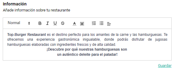 Por último, en la sección de “Información”, puedes incluir una breve descripción de tu restaurante. Esta información aparecerá en la página de pedidos online, permitiendo a tus clientes conocer más sobre tu establecimiento.