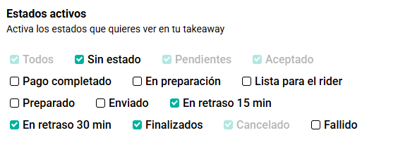 Además de estos estados básicos, puedes seleccionar otros estados adicionales que se ajusten a tu flujo de trabajo y proceso de preparación de pedidos, como por ejemplo “Retraso 15 min” o “Retraso 30 min”, por si ocurre algo inesperado. Marca o desmarca los estados según tus preferencias y necesidades de gestión. Asegúrate de guardar los cambios realizados para aplicar la configuración.