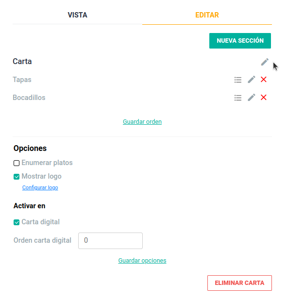 Si desea agregar nuevas secciones en la carta, haga clic en el botón “nueva sección” ubicado en la parte superior del panel derecho. Asigne un nombre a la nueva sección y agregue los platos deseados. Y seguir los pasos del punto 6.