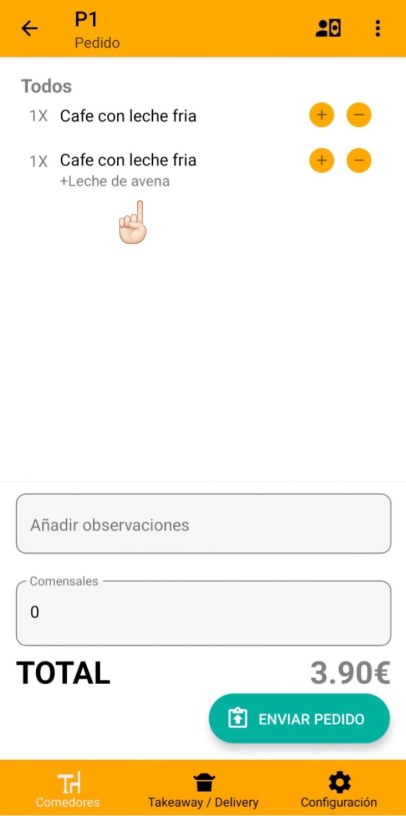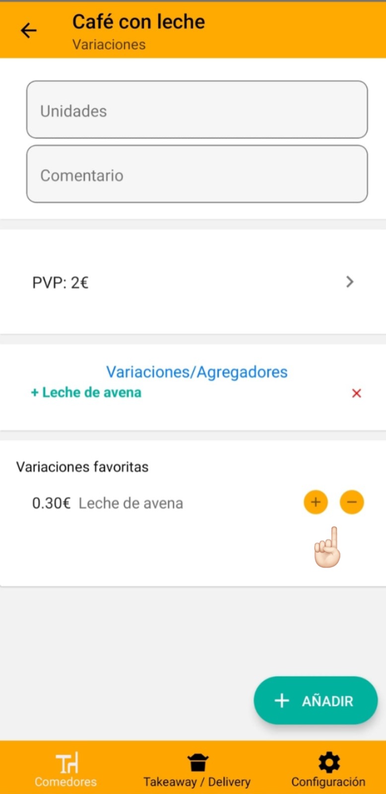 Despu茅s de introducir las variaciones, pulsa en A帽adir. Si la variaci贸n tiene un precio adicional, este se sumar谩 autom谩ticamente al total del art铆culo. A continuaci贸n, podr谩s ver el precio total actualizado de la comanda.