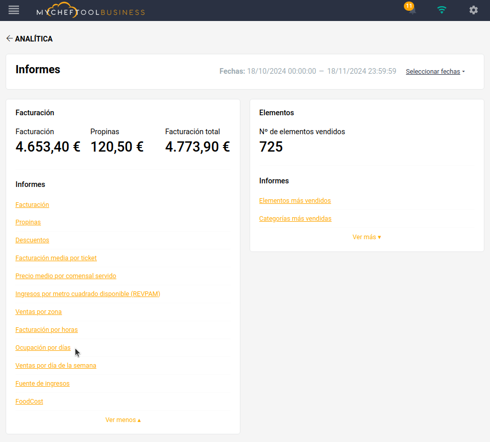 Para consultar el número total de comensales atendidos, dirígete a la sección de Analítica en tu sistema, selecciona Informes y luego Ocupación por días.
