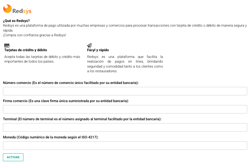 - Solicita la activación de una pasarela de pago Redsys para tu negocio.