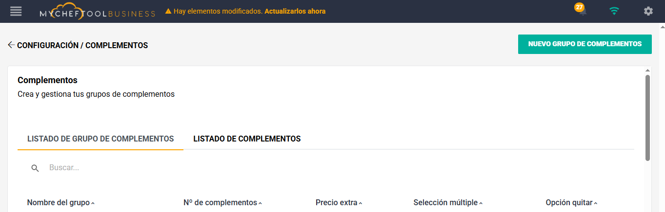 Haz clic en el botón arriba a la derecha, “Nuevo Grupo de Complementos” para comenzar a configurar tu grupo.