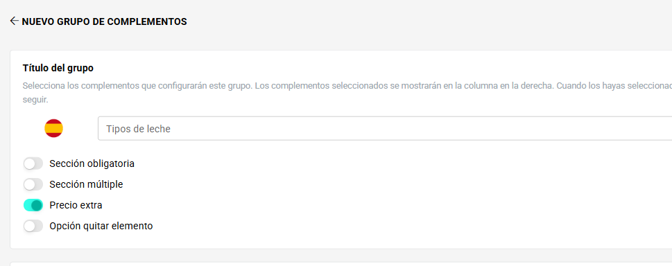 Asigna un nombre al grupo (por ejemplo, “Tipos de leche”) y selecciona las opciones que desees: