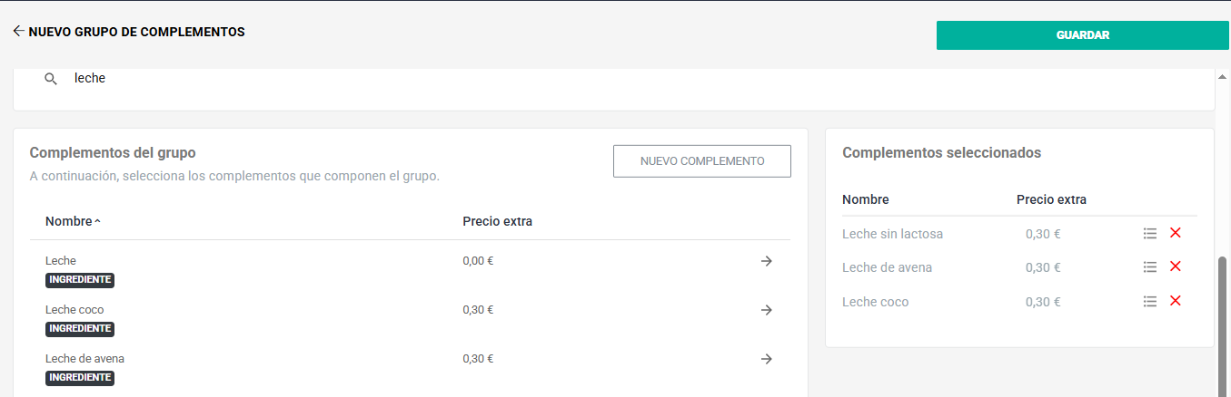 Ahora, selecciona los complementos que deseas agregar a este grupo. Como ejemplo, agregaremos las opciones de leche sin lactosa y bebida vegetal de avena. Deberás hacer clic en “Nuevo complemento”