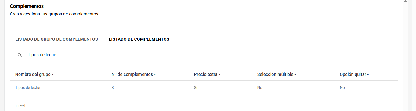 En MyChefTool, crear complementos para tus productos es una tarea fácil y rápida. Vamos a usar un ejemplo concreto: crear un complemento para un café con leche, donde ofreceremos diferentes opciones de leche, como leche sin lactosa o bebida vegetal de avena, algunas con un suplemento de precio y otras sin suplemento.